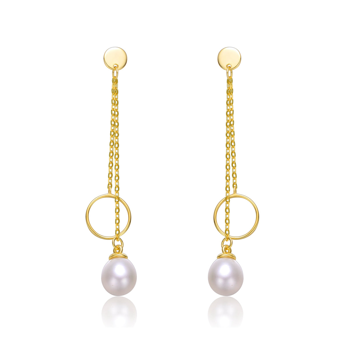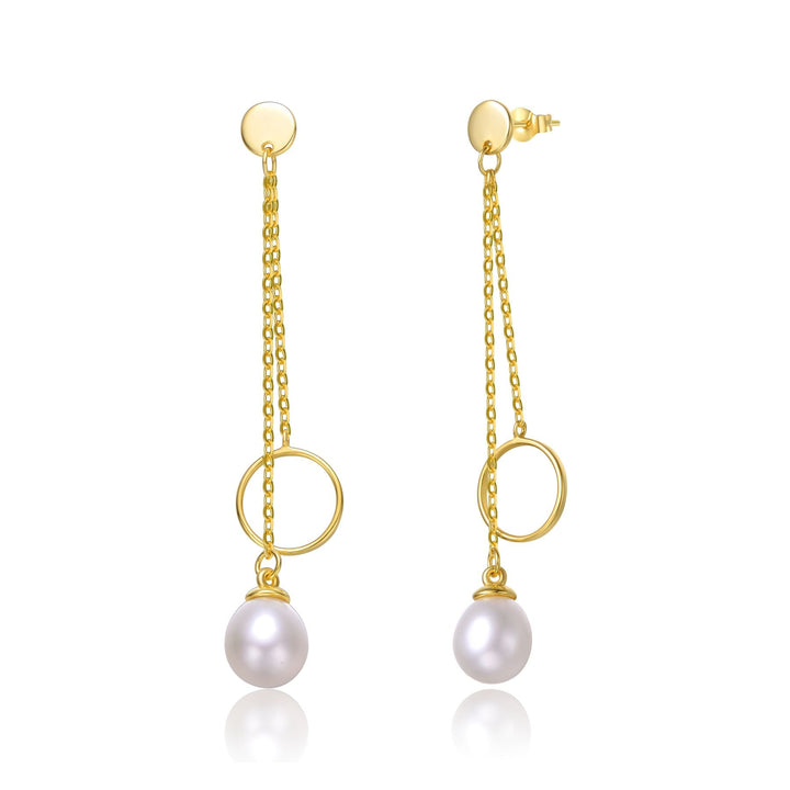 Sterling Silver 14k Yellow Gold with White Pearl Drop Geometric Shield Retro Dangle Earrings