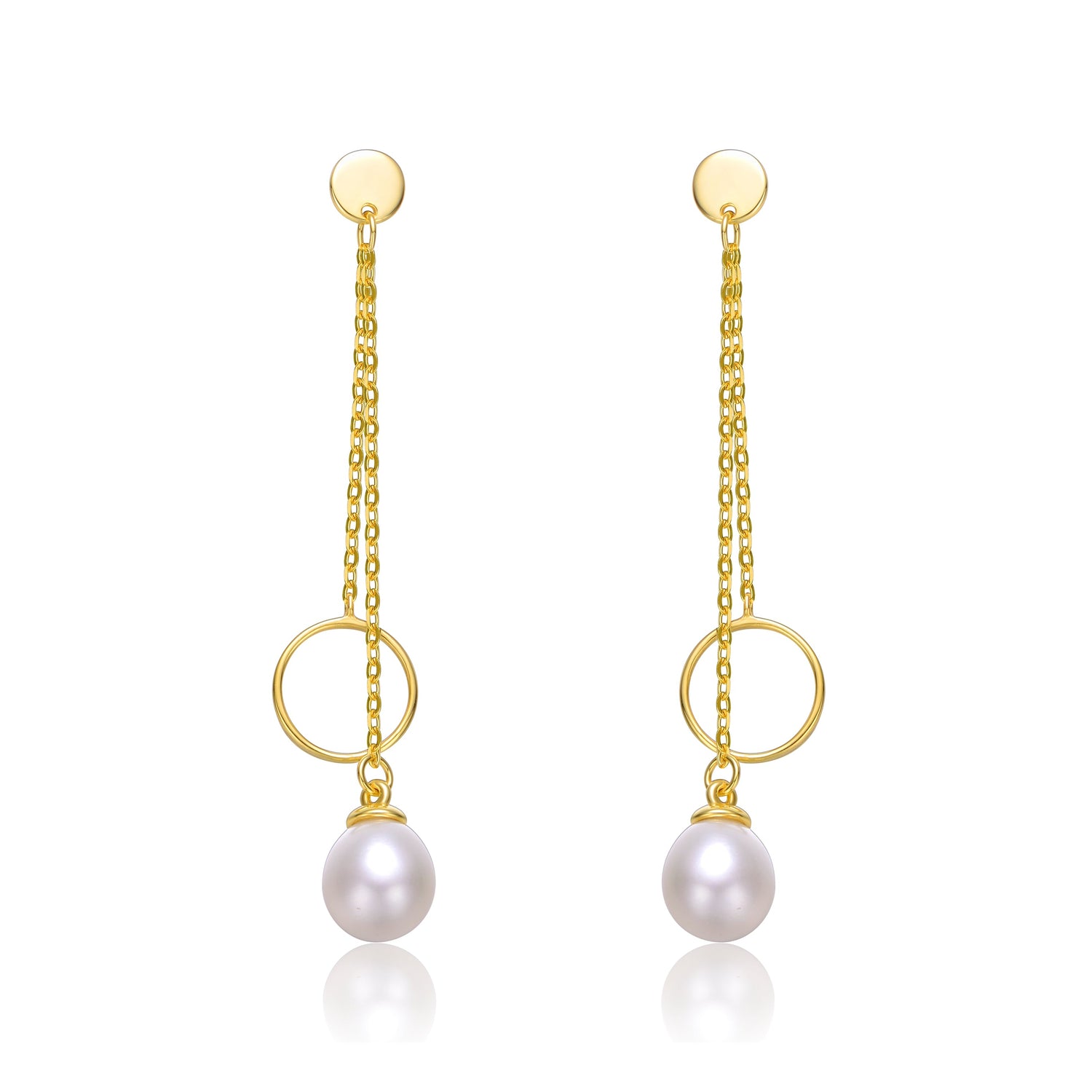These Sterling Silver 14k Yellow Gold Plated White Pearl Drop Geometric Shield Retro Dangle Earrings by Genevive Jewelry bring together vintage-inspired glamour with a contemporary twist. The shimmering white pearls (June birthstone) dangle effortlessly from asymmetrical eternity circles and geometric shield-inspired studs, creating a captivating fringe movement. Crafted in 14k yellow gold-plated sterling silver, these earrings offer a bold yet refined statement. Designed to complement both modern and classic styles, they are an effortless way to add intrigue and elegance to your jewelry collection.