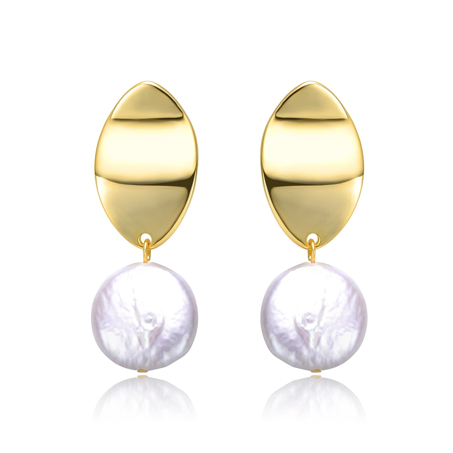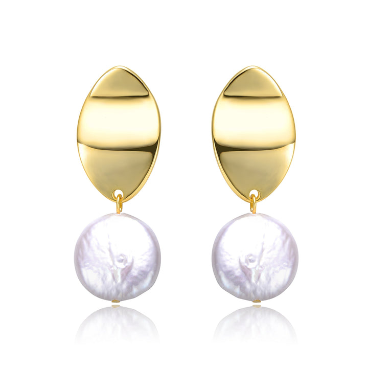 Sterling Silver 14k Yellow Gold Plated with White Coin Pearl Dangle Drop Marquise Medallion Earrings