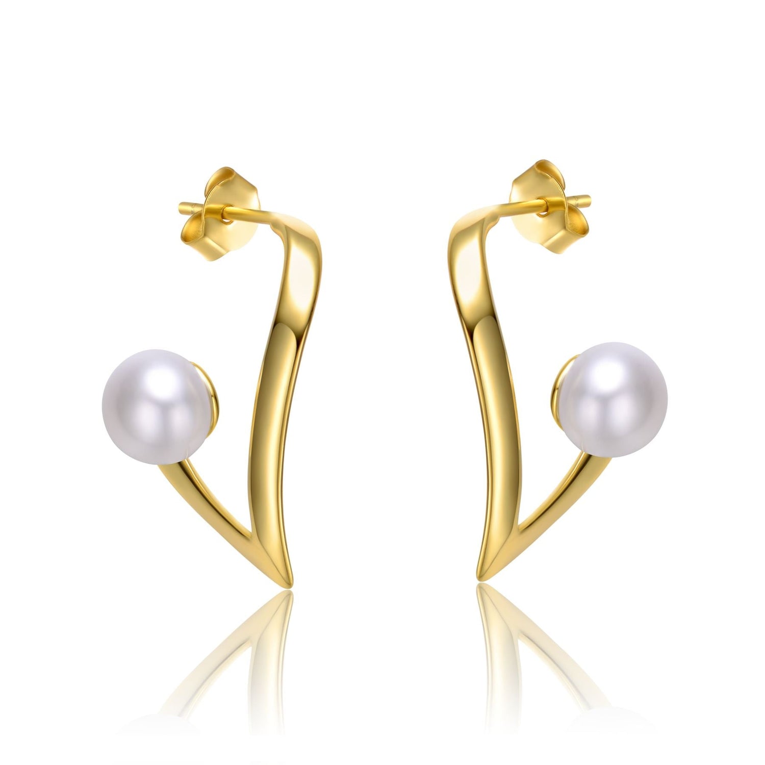 Sterling silver with 14k yellow gold plating and white pearls. Measurement: 23mm. Butterfly backs for secure closure.