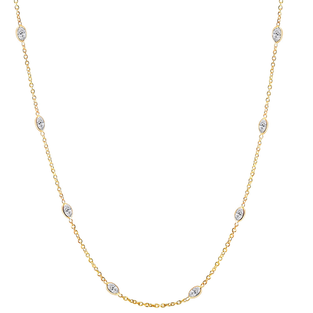 The 3 1/4ct Oval Shape Diamonds by the Yard Necklace by Pompeii3 features 12 pear-shaped brilliant cut lab-grown diamonds, all bezel set in solid 14k yellow gold. The 18' necklace is secured with a lobster clasp, making it a high-quality and stunning addition to any jewelry collection.
