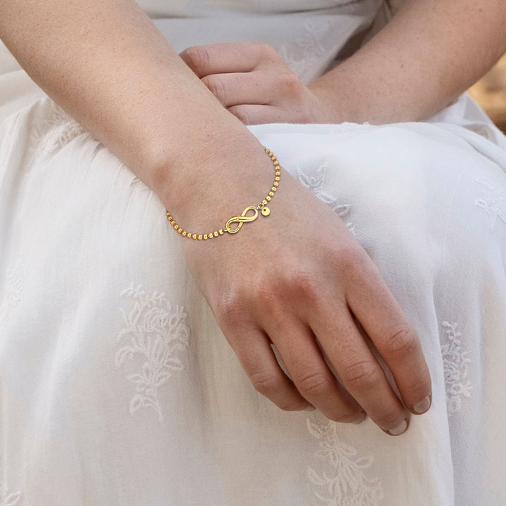 Made from sterling silver, this bracelet features ball links and an infinity symbol clasp. It measures 7.5 inches in length, designed to fit most wrist sizes comfortably.