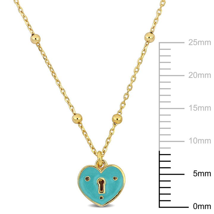 Crafted in yellow-plated sterling silver with a turquoise enamel heart pendant. Chain length: 16.5 inches with a 1-inch extender. Diamond-cut cable chain with ball beads.