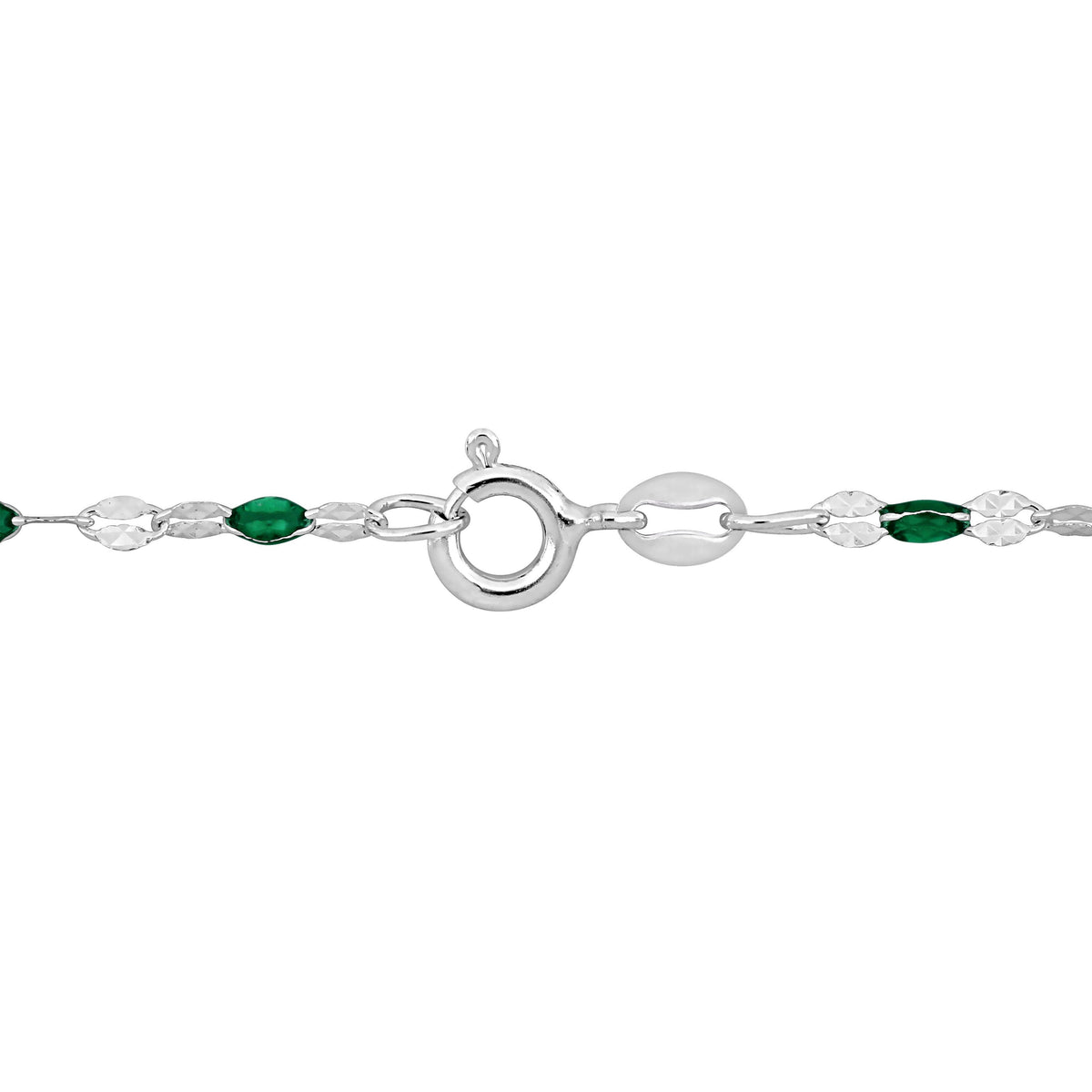 Sterling silver. Green enamel bead accents. 18-inch chain with lobster clasp. Perfect for layering or wearing solo.