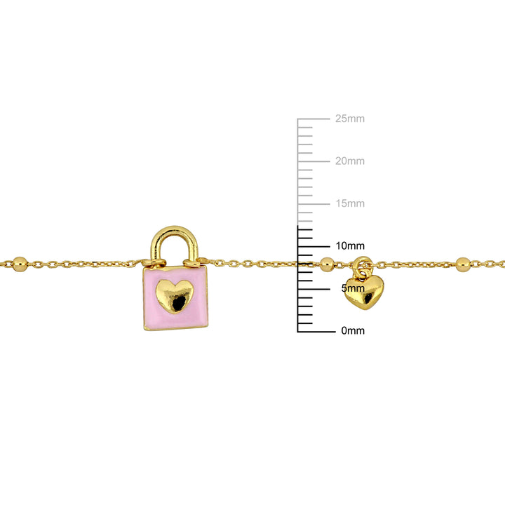 Made with yellow-plated sterling silver, this necklace features a lock and heart charm adorned with pink enamel. It includes a 16.5-inch chain with a 1-inch extender, finished with a diamond-cut ball bead design.