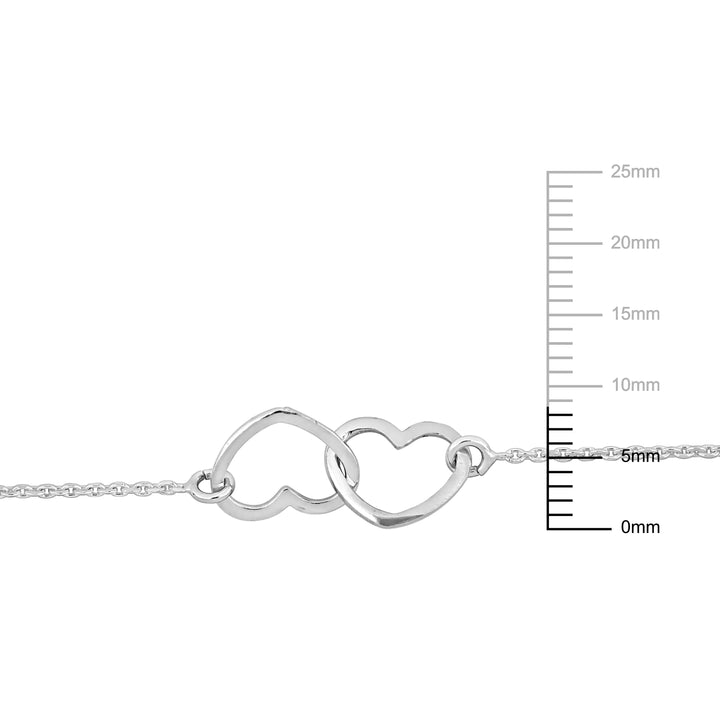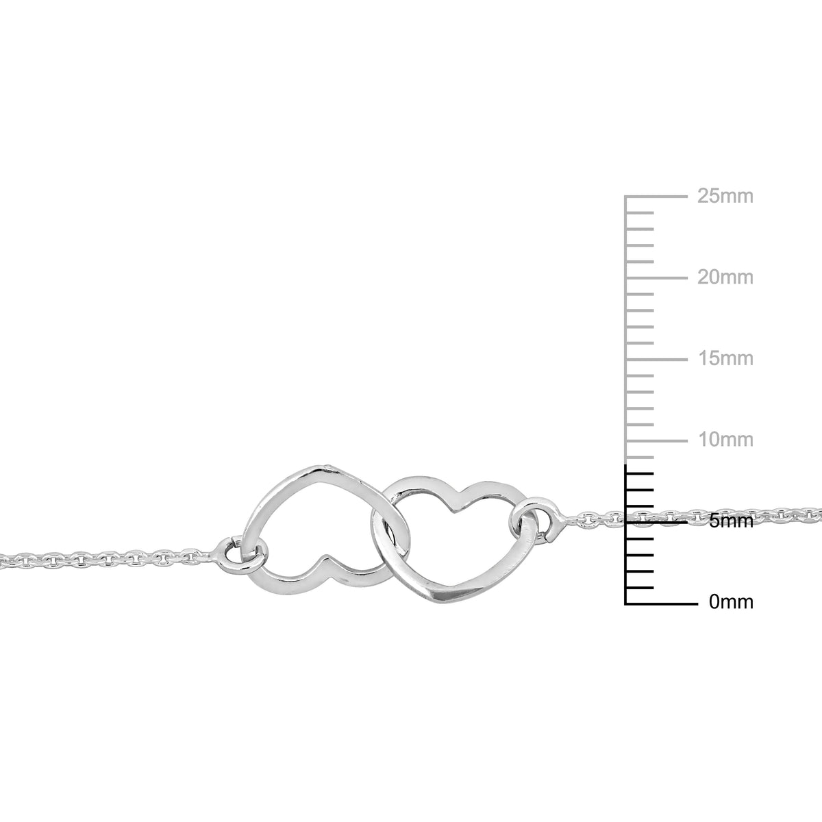 Crafted in sterling silver with two intertwined heart charms. Bracelet length: 7 inches + 1-inch extension. Lobster clasp closure.