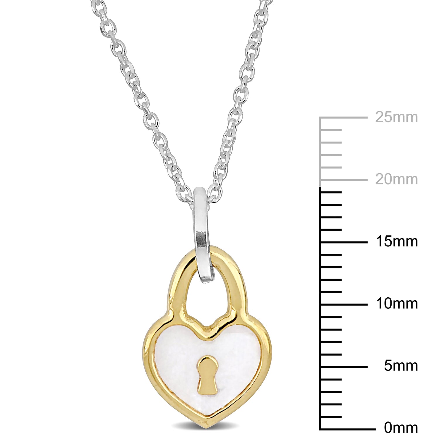 Crafted in sterling silver with white and yellow finishes, featuring a heart-shaped lock charm with white enamel detailing. The necklace measures 16 inches in length with a 2-inch extender for an adjustable fit.