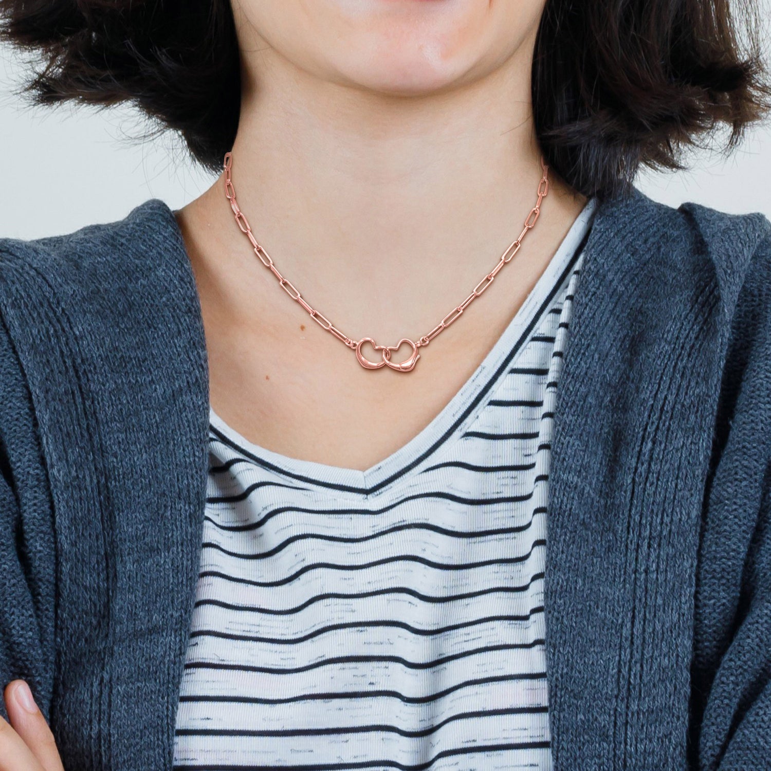 This Pink Paper Clip Link Necklace by Mimi & Max exudes romance with its soft rose-toned sterling silver and delicate design. The modern paper clip links are complemented by a double heart clasp, making this necklace a meaningful gift or personal keepsake. Perfect for layering or wearing solo, this piece adds a subtle yet elegant touch to any outfit.