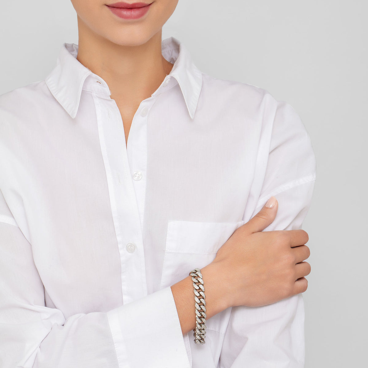 The Adornia Flat Curb CZ Chain Bracelet in Silver is an eye-catching piece that combines modern trends with classic luxury. Made from white rhodium-plated brass, the bracelet features a 15mm wide curb chain that exudes a bold yet refined look. The 8' length makes it versatile and easy to wear, while the clasp closure ensures a secure fit. This bracelet is ideal for both everyday wear and special occasions, offering the perfect balance of style and sophistication.