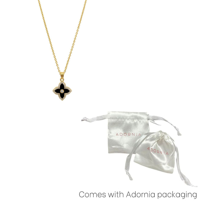 The Adornia Black Clover Necklace in Gold is a luxurious, everyday statement piece. It features a 14k yellow gold-plated brass pendant shaped like a black clover, with an adjustable 16-18' chain. The delicate pendant (measuring 0.75' tall x 0.5' wide) offers a versatile design, perfect for layering or wearing solo. This necklace brings a chic and modern vibe to any outfit, ideal for casual or semi-formal occasions.