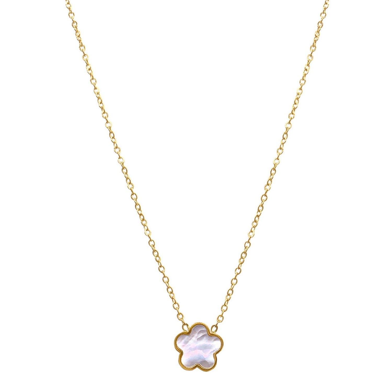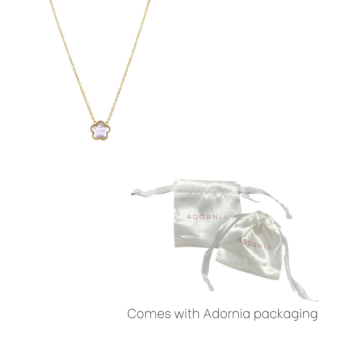 The White Mother of Pearl Clover Necklace by Adornia brings everyday luxury with a delicate, nature-inspired design. Featuring a luminous mother of pearl clover set in gold-plated brass, this piece offers a soft, radiant finish perfect for adding charm and polish to your daily look.