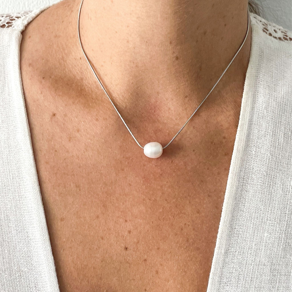 Made from white rhodium-plated brass with a 10mm freshwater pearl. The chain measures 16-18 inches in length with a lobster clasp.