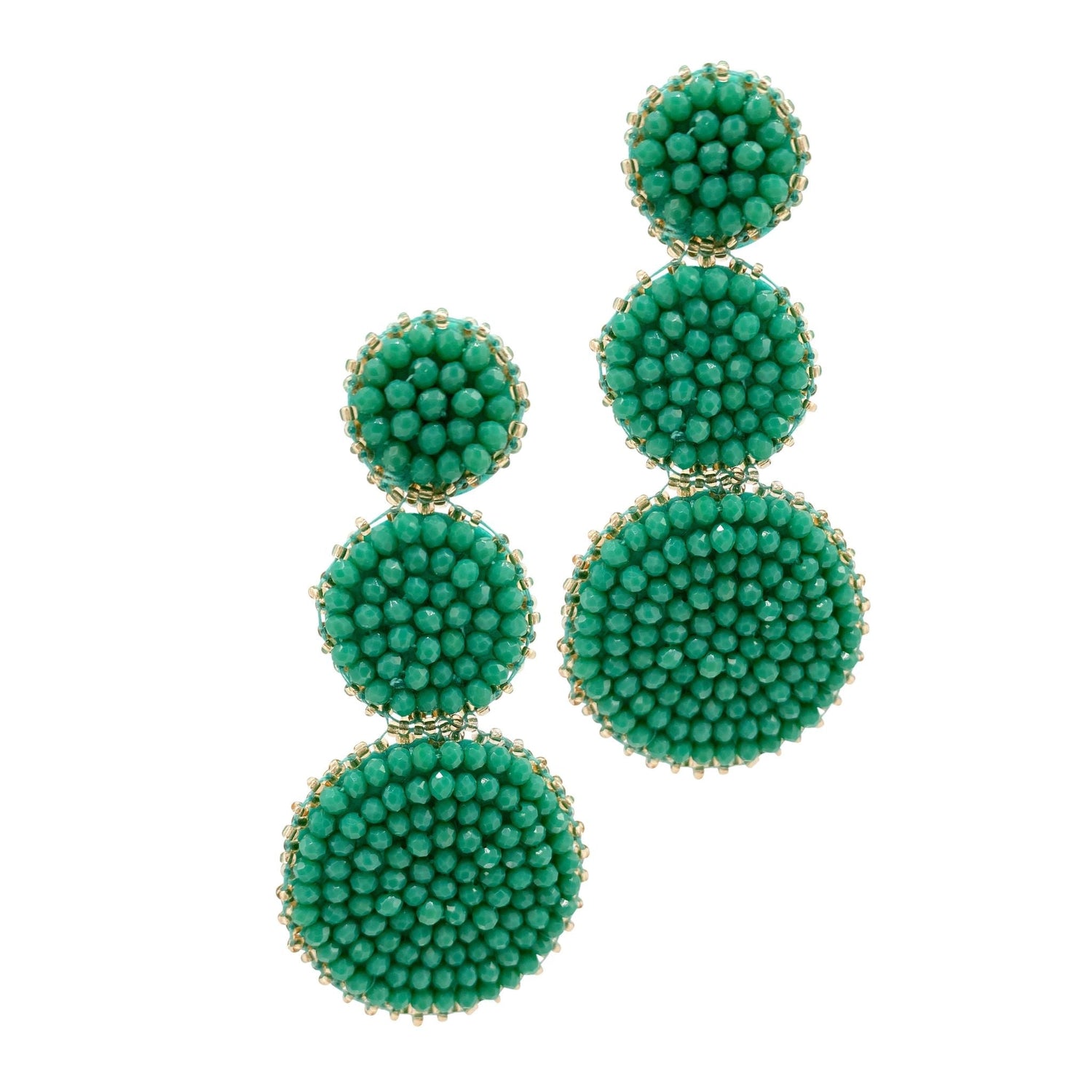 Made from 14K yellow gold-plated brass, featuring green beads, 3.25' long x 1.5' wide, circles diameter: 0.75', 1', 1.5'.