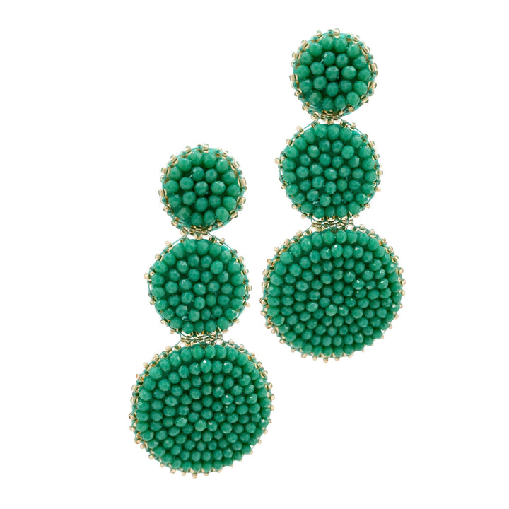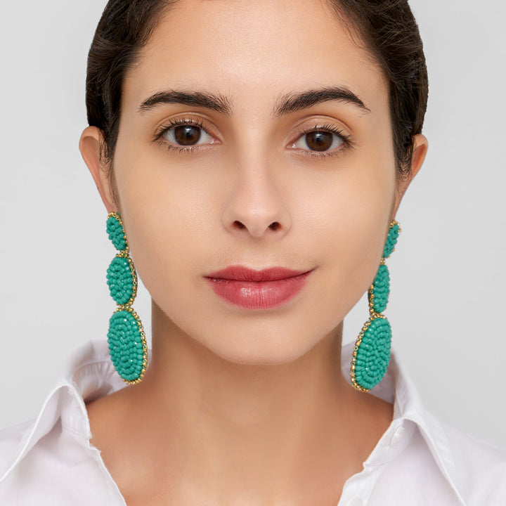 These Adornia Green Beaded Drop Earrings combine elegance with a pop of color. The earrings feature three interlocking circles of varying sizes, adorned with green beads. The gold-plated brass design adds a sophisticated touch to the bold color palette, making these earrings an eye-catching addition to your collection.