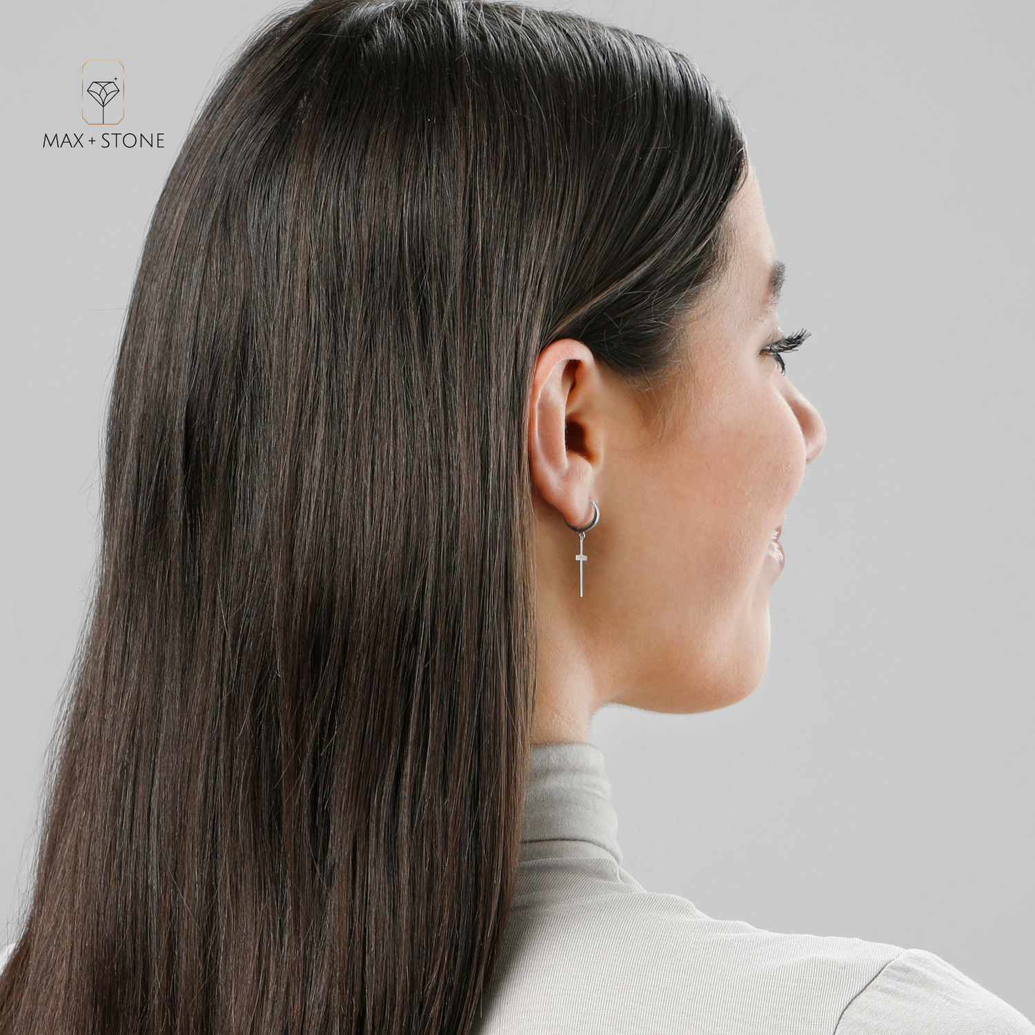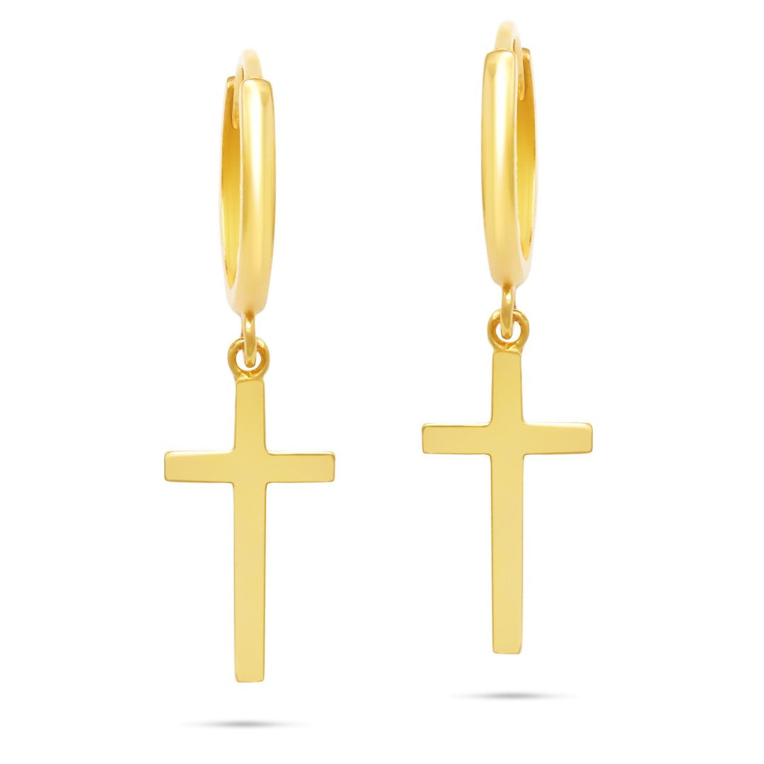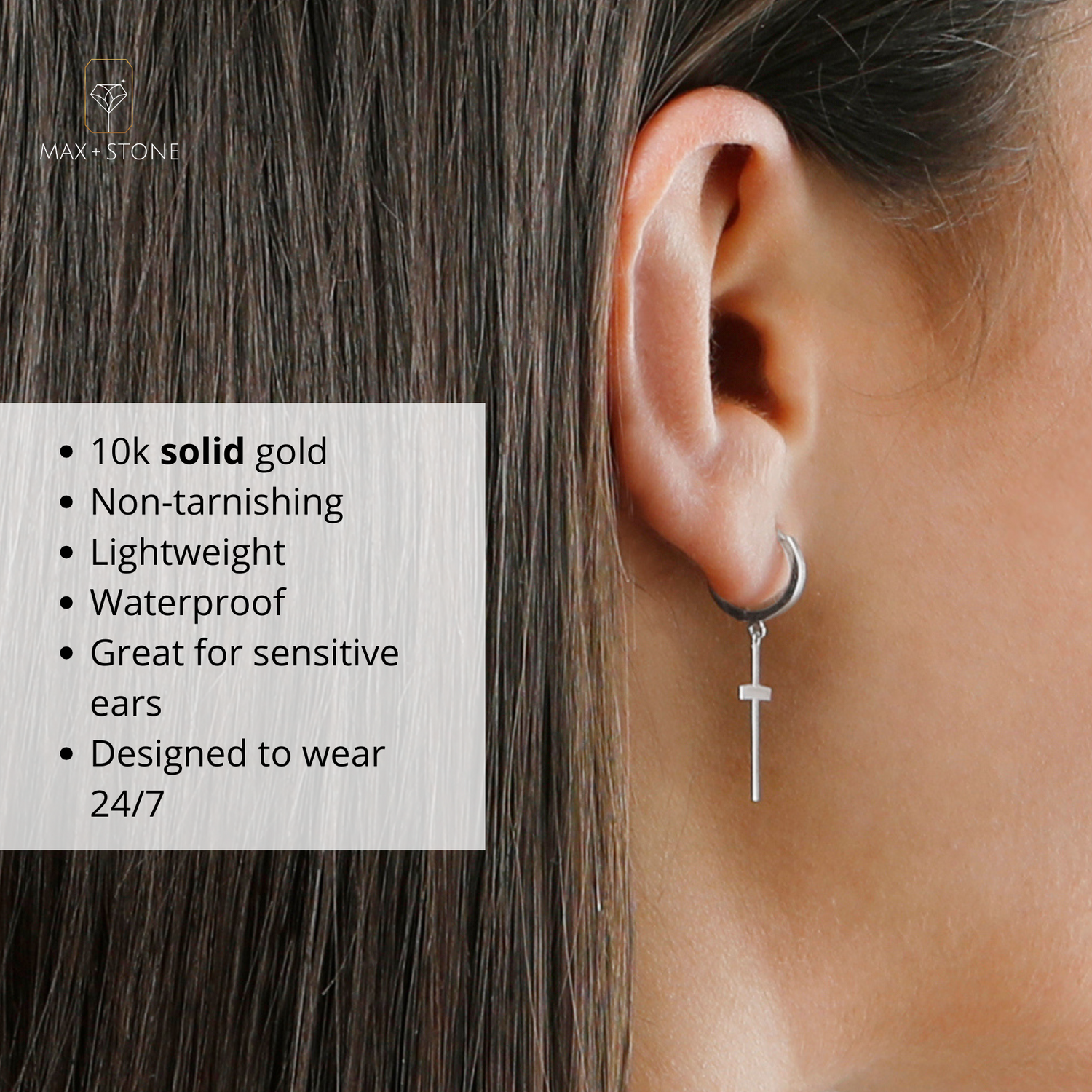 Made from solid 10k yellow or white gold, featuring a cross dangle element. Earrings measure just over 1 inch in total length, with the hoop measuring 0.40 inches (11mm).