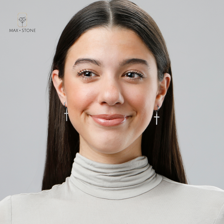 These Dangle Cross and Hidden Notched Small Huggie Hoop Earrings by MaxColor are a stunning blend of elegance and spiritual symbolism. Crafted in solid 10k yellow or white gold, these earrings feature a charming cross dangle element, suspended from a secure and stylish huggie hoop. The earrings are designed to make a bold statement while maintaining a subtle and sophisticated aesthetic. With a hanging length of just over 1 inch, these earrings are perfect for both casual and formal occasions.