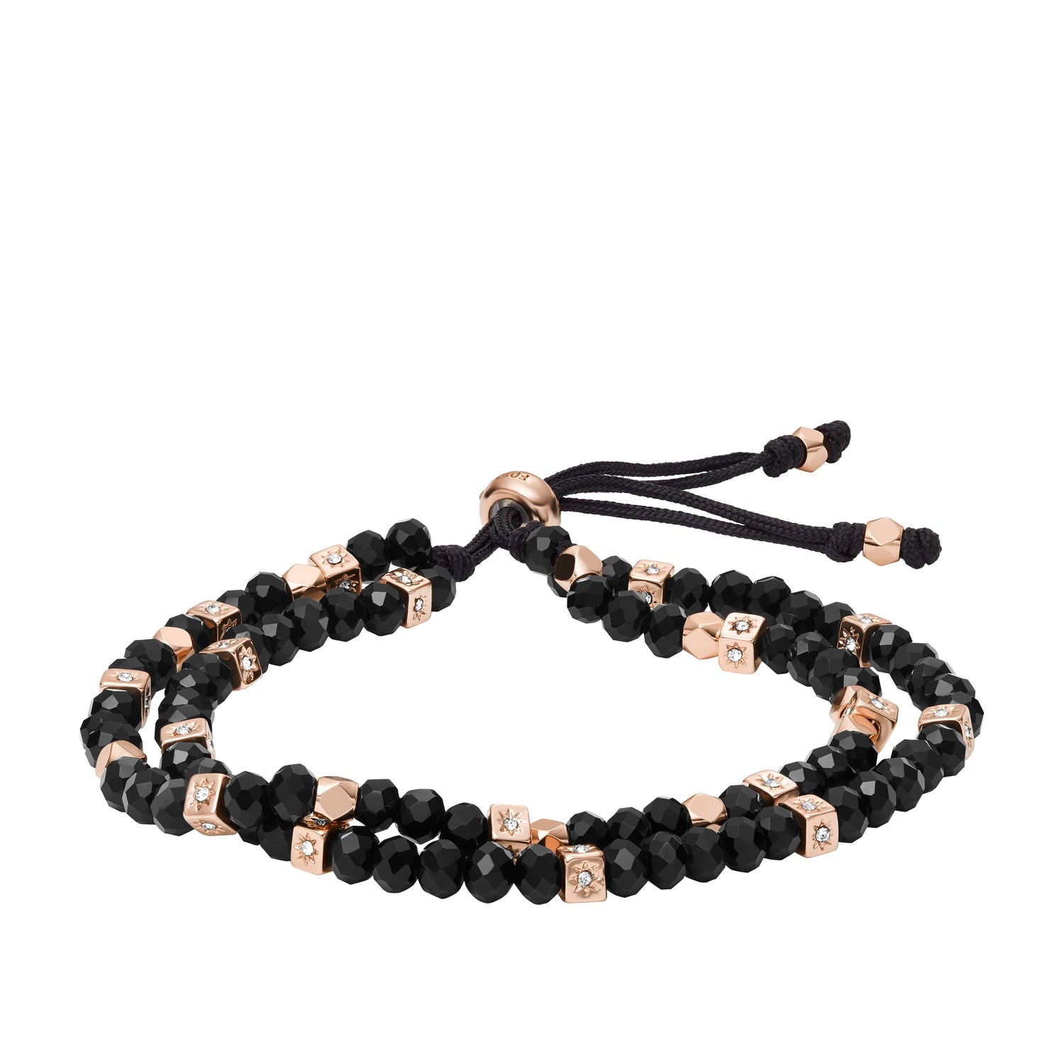 Crafted from brass with black glass beads and rose gold-tone finish. Features a slider closure.