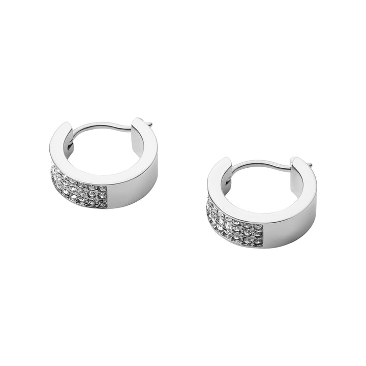 These Stainless Steel Hoop Earrings by Fossil offer a fresh, contemporary twist on a classic silhouette. Featuring pavé crystal accents for added sparkle, these sleek huggie hoops bring understated glamour to everyday styling.