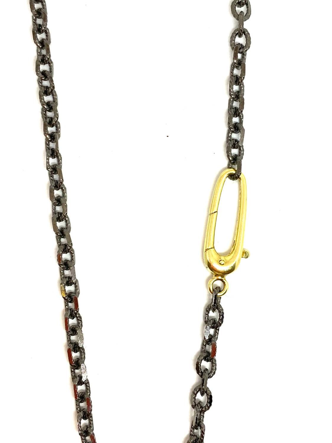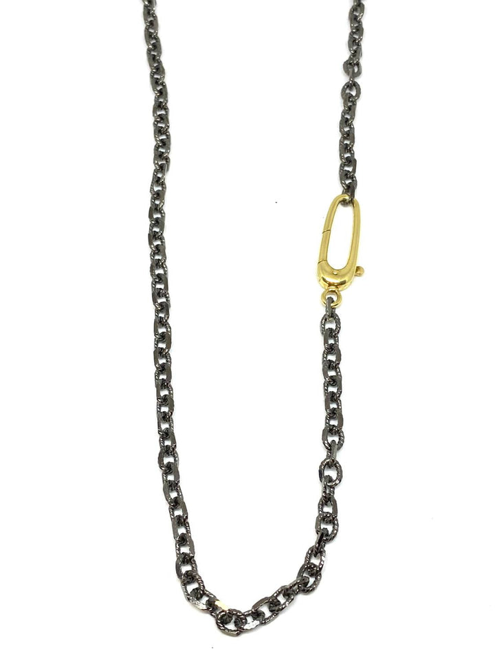 This Textured Chain Necklace in Silver by Nathan & Moe is the perfect stand-out piece to complement even the most basic outfits. Featuring long oval silver links and a long gold oval lobster claw clasp, this necklace blends bohemian chic with a touch of rocker style.