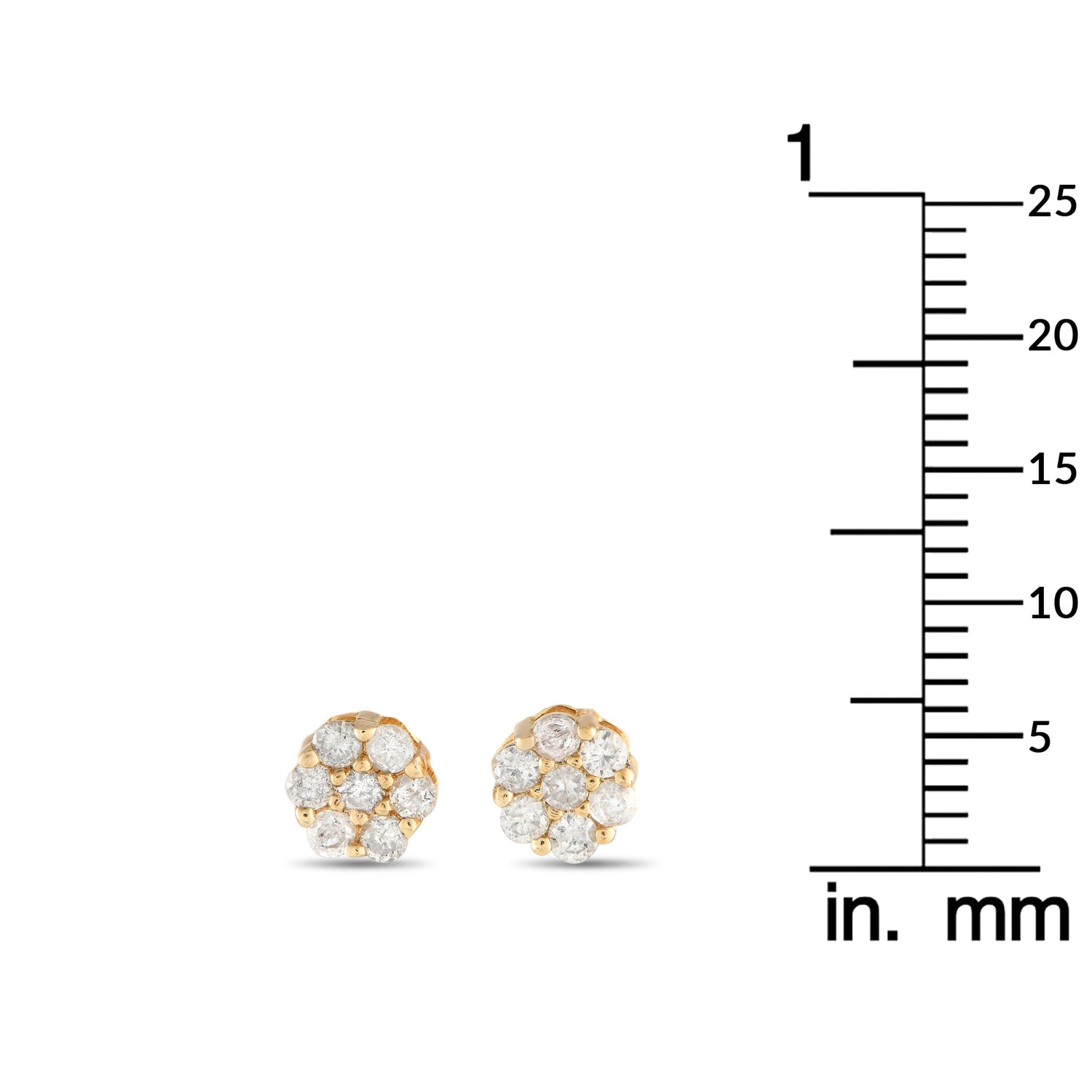 Crafted from 14K yellow gold with 0.25 carats of round diamonds. Earrings measure 0.15 inches in diameter and feature screw-back closures.