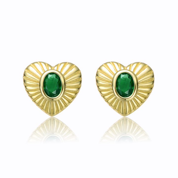 Crafted in sterling silver with 14K yellow gold plating, featuring oval-cut emerald-like cubic zirconia stones. The heart-shaped studs have textured sunray accents, measuring 9mm. Secured with butterfly backs.