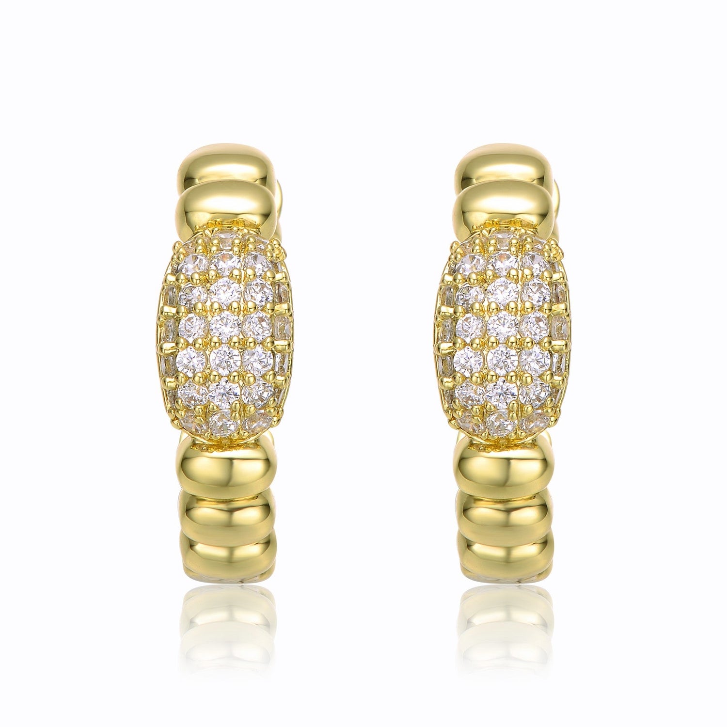 These Sterling Silver 14k Yellow Gold Plated with Cubic Zirconia Scalloped Huggie Hoop Earrings by Genevive Jewelry are a glamorous yet modern design. The earrings feature pave-set round cubic zirconia stones, with a scalloped-textured hoop for a unique touch. The 14k yellow gold plating adds a rich shine to the design, making them perfect for day-to-night wear. These huggie hoops sit close to the ear, offering a secure and comfortable fit with hinge backs. Whether for everyday elegance or special occasions, these earrings are a must-have.