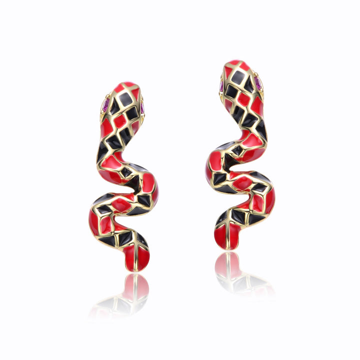 RG 14k Yellow Gold Plated with Ruby Cubic Zirconia Black & Red Enamel 3D Slithering Curling Snake Earrings