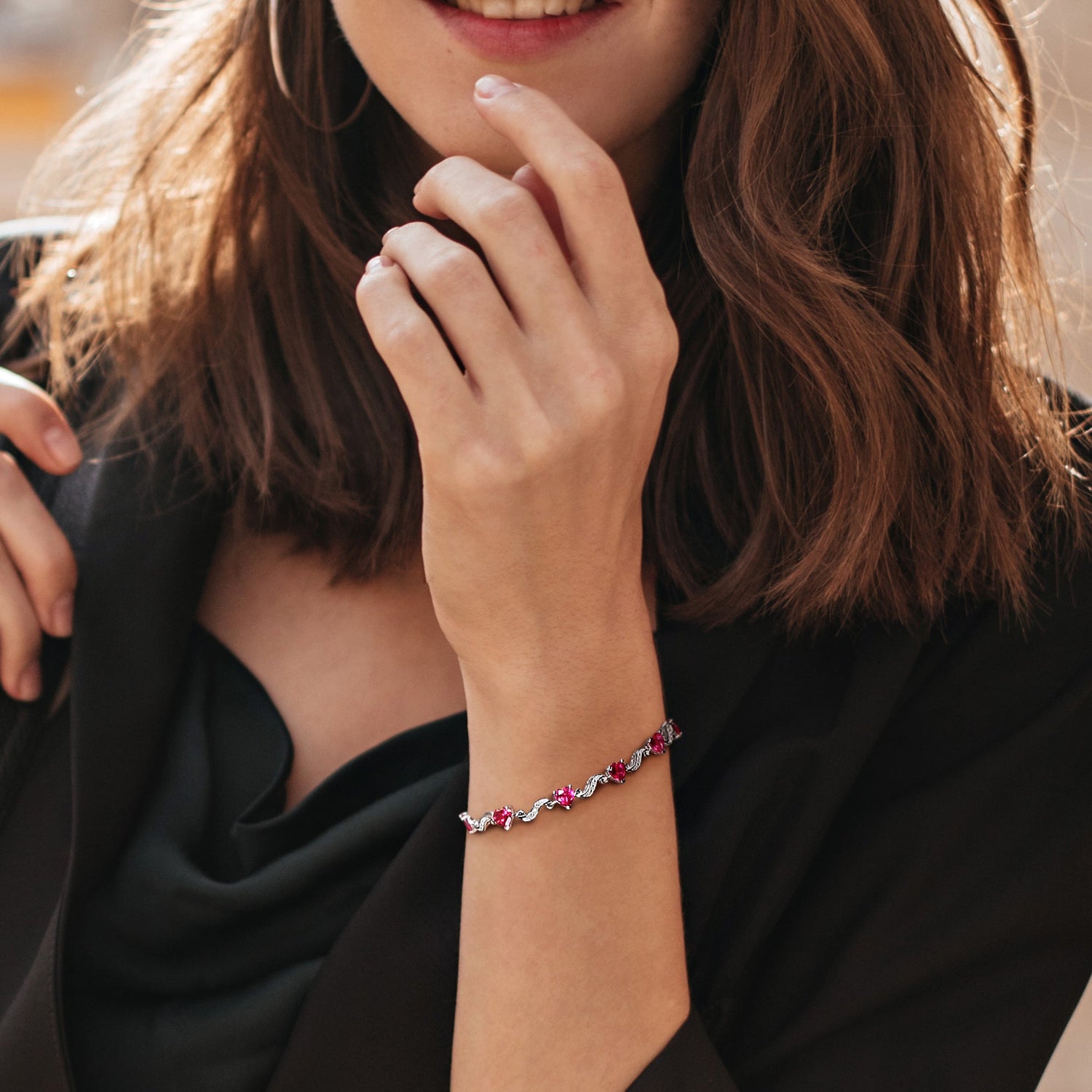 Sterling silver with 9 heart-cut created rubies, totaling 9 carats, and 2 round white diamonds totaling 0.02 carats. Bracelet dimensions: 7mm wide x 7 inches long. Lobster claw clasp.