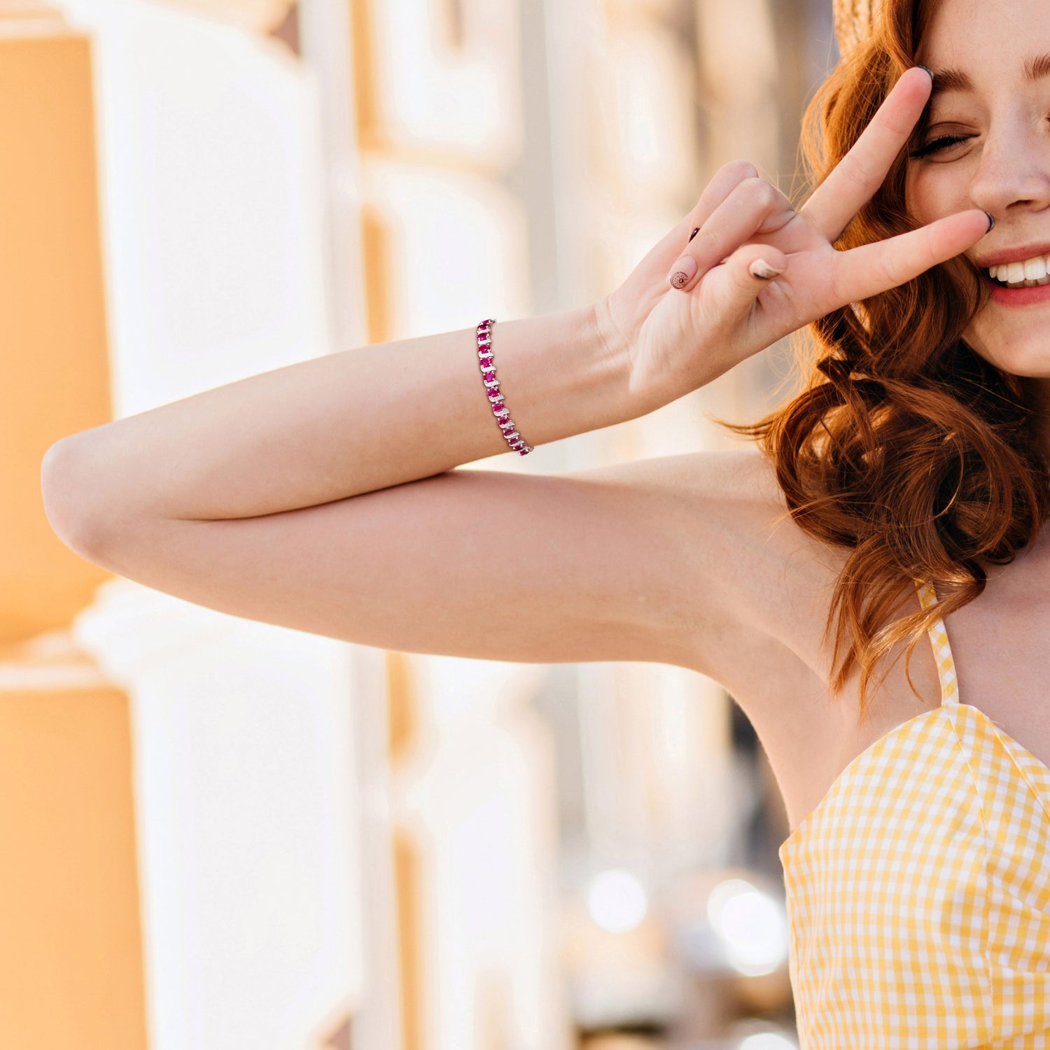 This 18ct TGW Created Ruby and Diamond S-Link Bracelet by Mimi & Max is a striking symbol of passion and elegance. Featuring 18.00 ct. t.w. of created rubies, each deep red oval gemstone is elegantly linked in an S-shaped sterling silver setting. Three round bead-set diamonds add subtle brilliance, complementing the fiery hues of the rubies. A classic tennis bracelet design with a secure pressure clasp and safety catch, this piece is both timeless and bold, making it the perfect gift for any occasion.