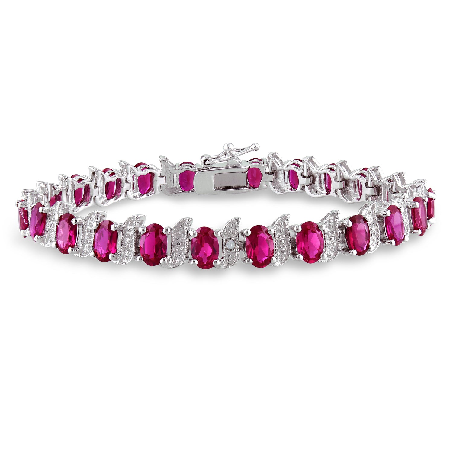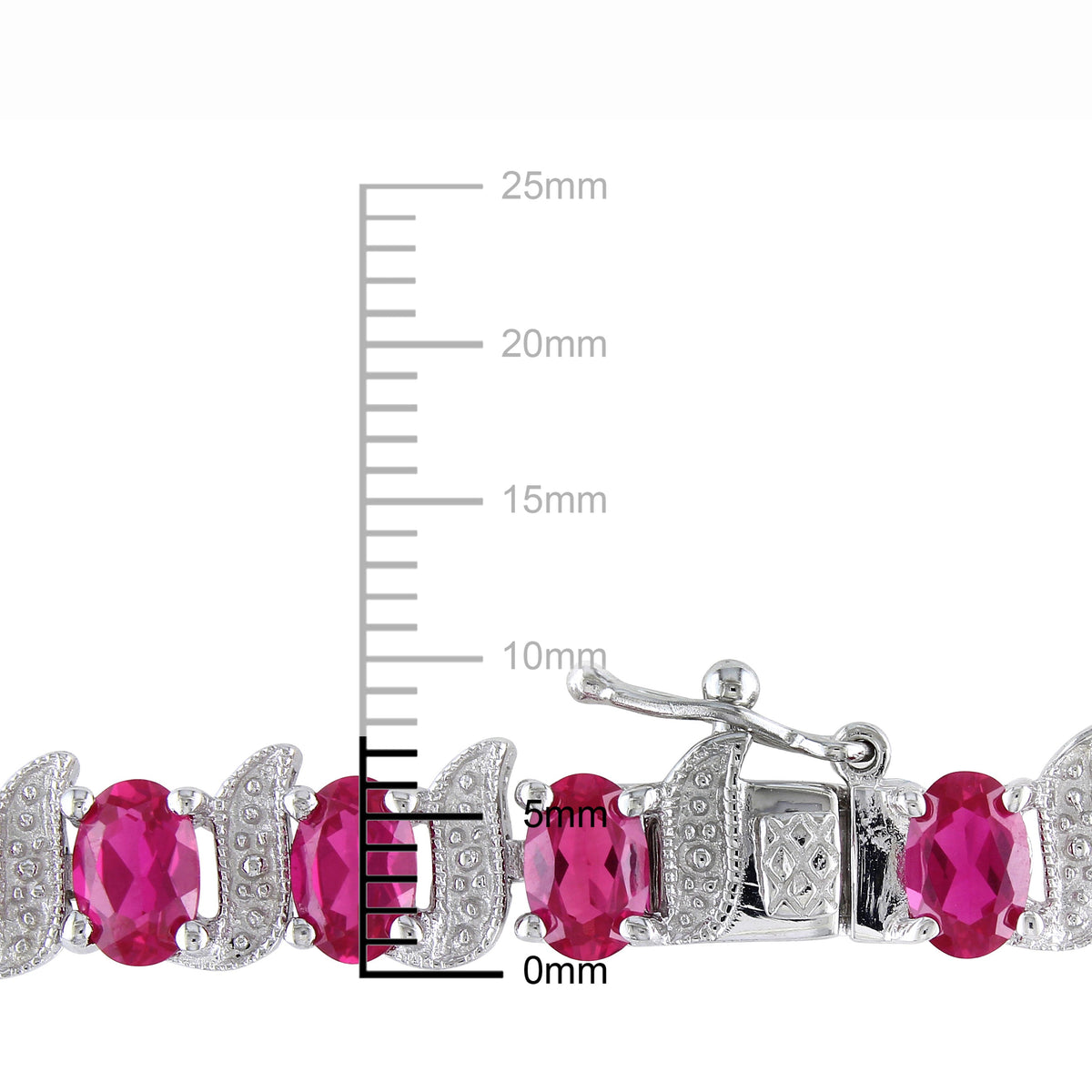 Crafted in sterling silver, featuring 18.00 ct. t.w. created oval rubies and .03 ct. t.w. round diamonds. Diamond color: I-J, clarity: I3-I4. Bracelet width: 7mm. Length: 7 inches.