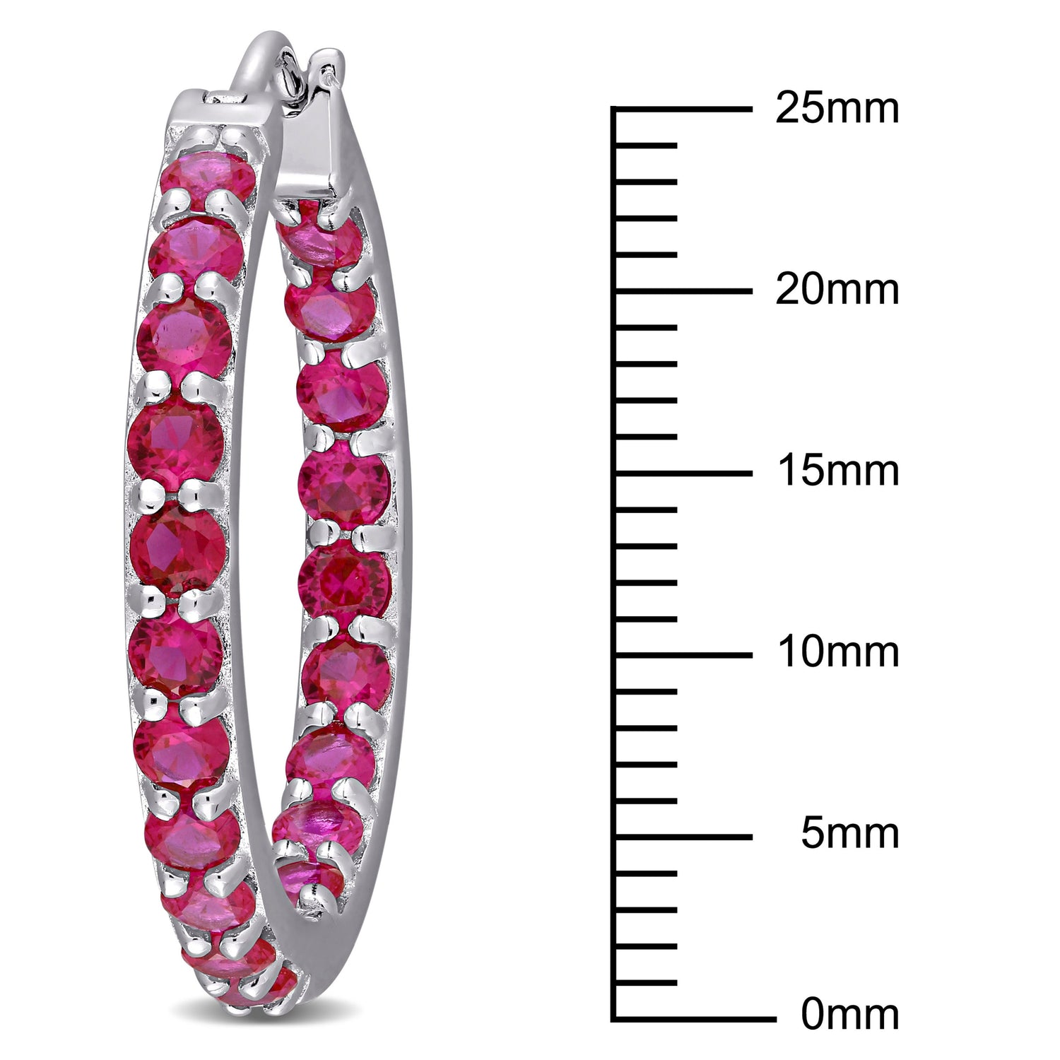 The Mimi & Max 3ct TGW Created Ruby Inside-Outside Hoop Earrings in Sterling Silver are a classic addition to any jewelry collection. Featuring 40 prong-set round-cut created ruby gemstones, these hoop earrings shine with a total gemstone weight of 3 1/5 carats. Set in high-polish sterling silver and secured with clip-in backs, these earrings are a perfect blend of sophistication and color, ideal for any occasion.
