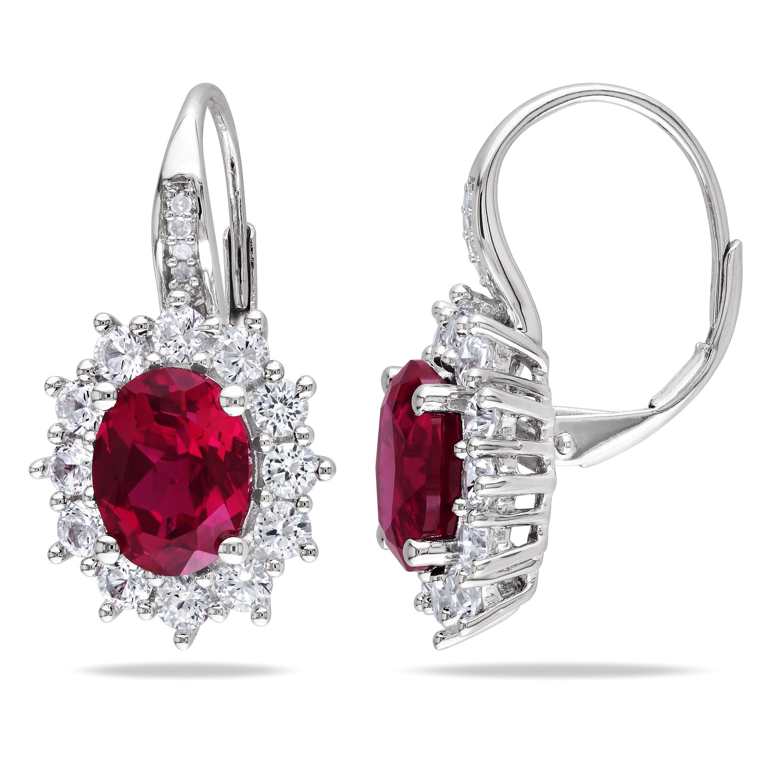 Crafted in sterling silver with 5 4/5 carats of created rubies, 2 1/6 carats of created white sapphires, and 0.04 carats of white diamonds. Earring dimensions: 13.7 mm wide x 25.2 mm long. Leverback clasp.