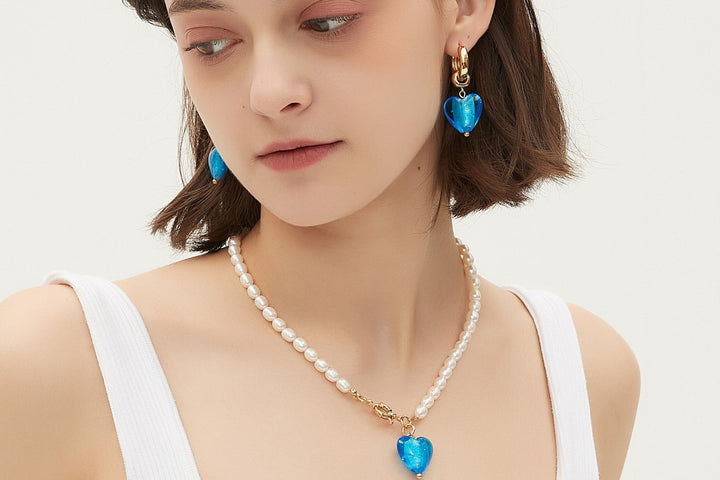 These Esmée Sky Blue Glaze Heart Dangle Earrings by Classicharms feature colorful handmade glass hearts with shimmering golden flecks. The 18k gold-plated hoops add a modern, chic touch, making these earrings a standout piece. Available in several colors, these unique earrings are perfect for adding a pop of color to your ensemble.