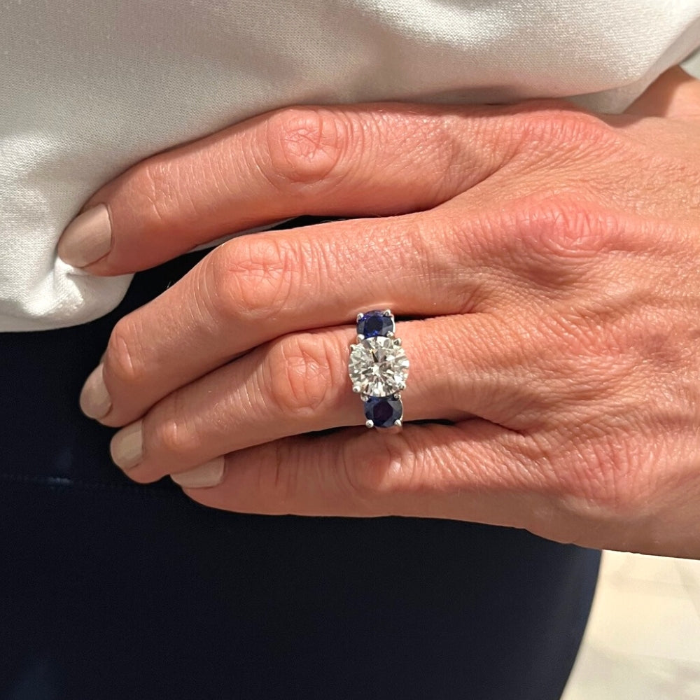 This Certified 5.03ct Diamond & Blue Sapphire Engagement Ring in 14k Gold is a breathtaking piece for a timeless proposal. Featuring a large 2ct round brilliant-cut IGI certified lab-grown diamond, it is flanked by two round brilliant-cut lab-created blue sapphires, all set in 14k white gold.