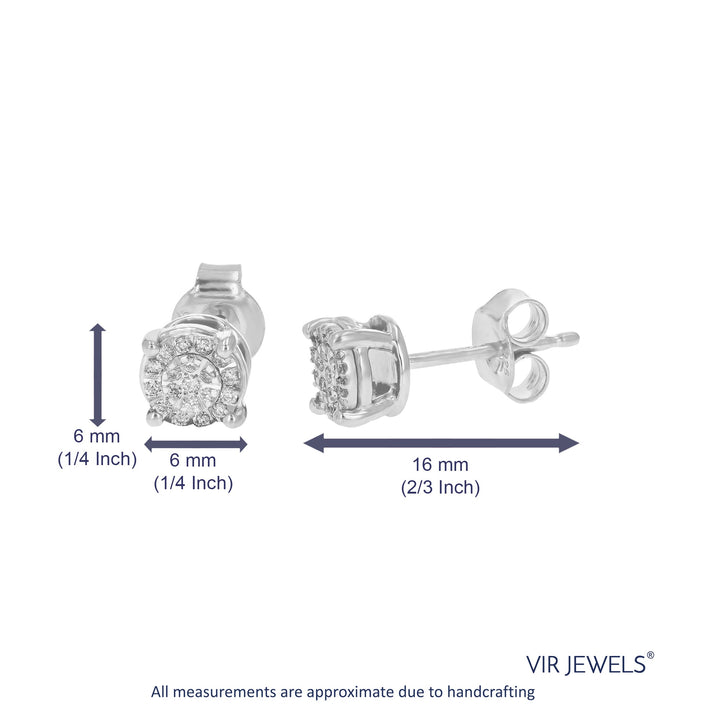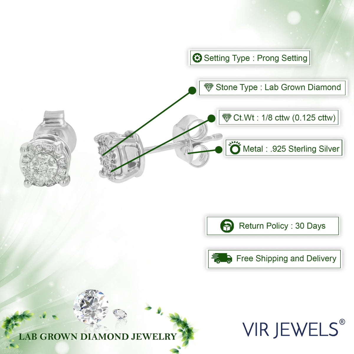 Crafted in .925 sterling silver with 1/8 cttw round-cut lab-grown diamonds. Diamonds are H-I color, SI1-SI2 clarity. Features a prong setting with 38 diamonds. Stud dimensions: Width: 6mm (1/4 inch), Height: 6mm (1/4 inch).