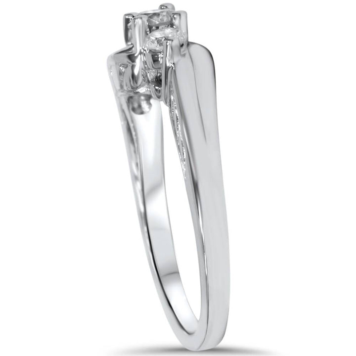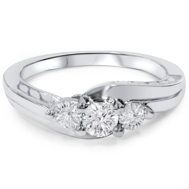 Solid 10K white gold with 1/2ct total diamond weight, featuring a 1/4ct center and two 1/10ct side stones. I2-I3 clarity, G-H diamond color.
