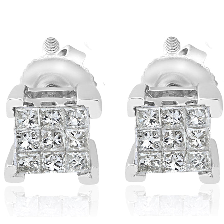 Features 1/3 ct total weight of princess-cut diamonds, invisibly set in 10k white gold. Screw-back settings for secure wear.