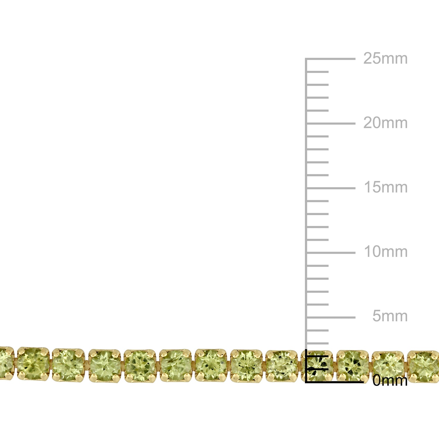 Crafted in yellow-plated sterling silver with 43 prong-set round-cut peridots (2.5mm) and two additional 3mm round-cut peridots. Total gemstone weight: 3 1/4 carats. Box clasp with slide lock. Bracelet length: 10 inches, width: 2.8mm. Metal weight: 3.9 grams.