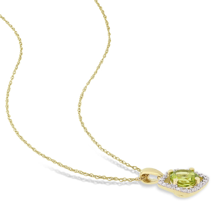 Set in 10k yellow gold, the pendant features a 7/8 carat round peridot surrounded by 20 round-cut white diamonds totaling 1/10 carat TDW. The pendant is 9.2 mm wide and 15 mm long, suspended from a 17' rope chain with a spring ring clasp.