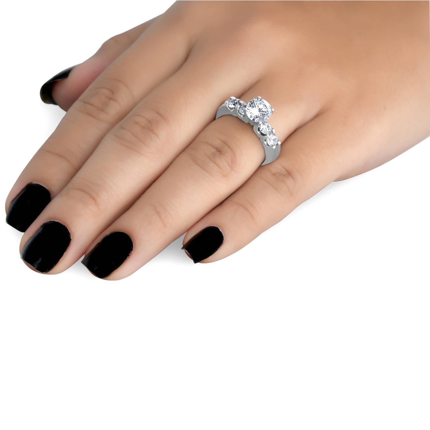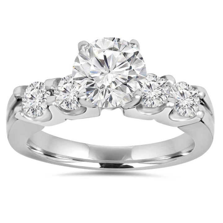 This 2.30Ct Round Solitaire Diamond Engagement Ring in 14K White Gold by Pompeii3 features a 1 1/2ct round brilliant cut lab grown diamond surrounded by four smaller round diamonds. The prong setting in solid 14k white gold adds elegance and durability, making this ring perfect for an engagement or special occasion.