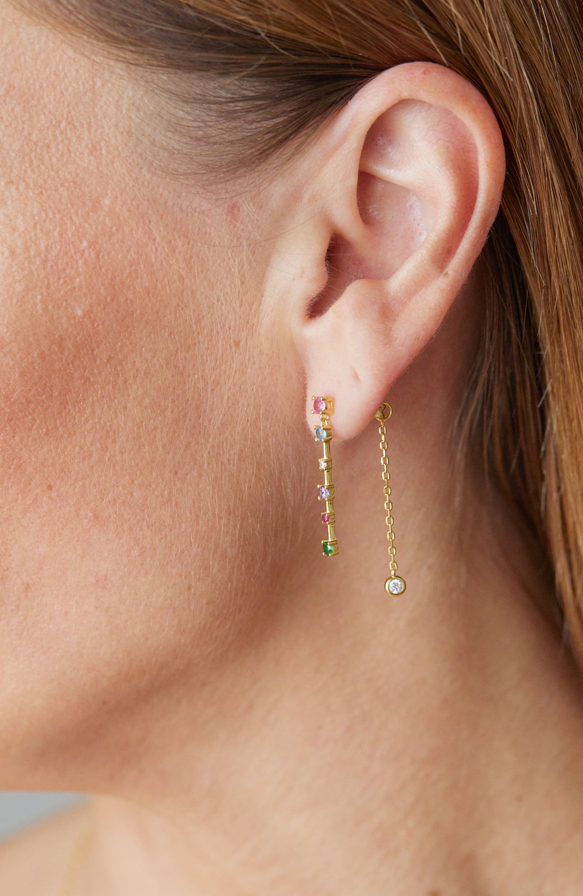 The 18K Gold Sterling Double Drop Earrings by Savvy Cie are a fashion-forward accessory that offers both elegance and edge. These earrings feature a double-drop design, with each drop dangling both from the front and back of the ear, creating a stunning 3-dimensional effect. Crafted from 18K gold-plated sterling silver and embellished with shimmering cubic zirconia stones, these earrings are the perfect addition to any look, offering a unique sparkle from every angle.