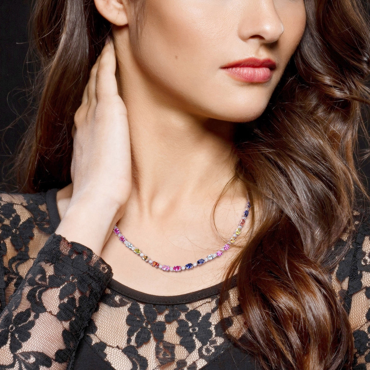 This Mimi & Max 24 1/2 CT TGW Multi-Color Created Sapphire Tennis Necklace is a stunning piece crafted in sterling silver. The necklace features 86 prong-set oval and round-cut created sapphires in a variety of captivating colors, including pink, yellow, blue, green, orange, and white. The delicate balance of colors and the modern station design add a sophisticated, dazzling touch to any outfit. With a total gemstone weight of 23 7/8 carats, this necklace makes a bold statement of elegance. Perfect for both everyday wear and special occasions, it’s a must-have addition to any jewelry collection.