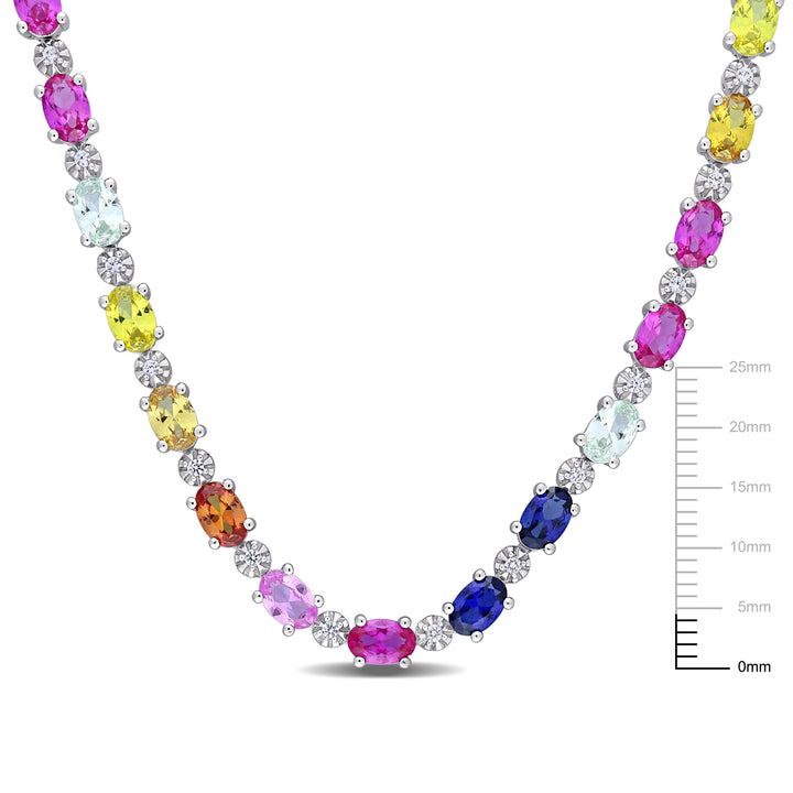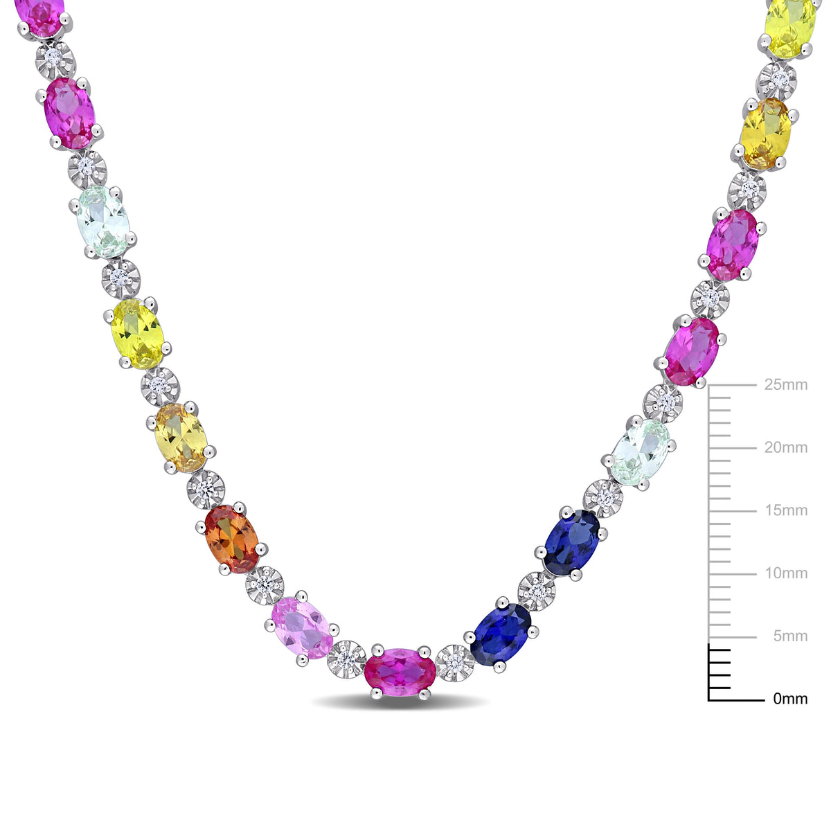 Sterling silver, created sapphires (pink, yellow, blue, green, orange, and white), prong setting. Total gemstone weight: 23 7/8 carats. Chain length: 16 inches. Clasp: Box. Necklace dimensions: 5.9 mm wide x 16 inches long. Metal weight: 20 grams.