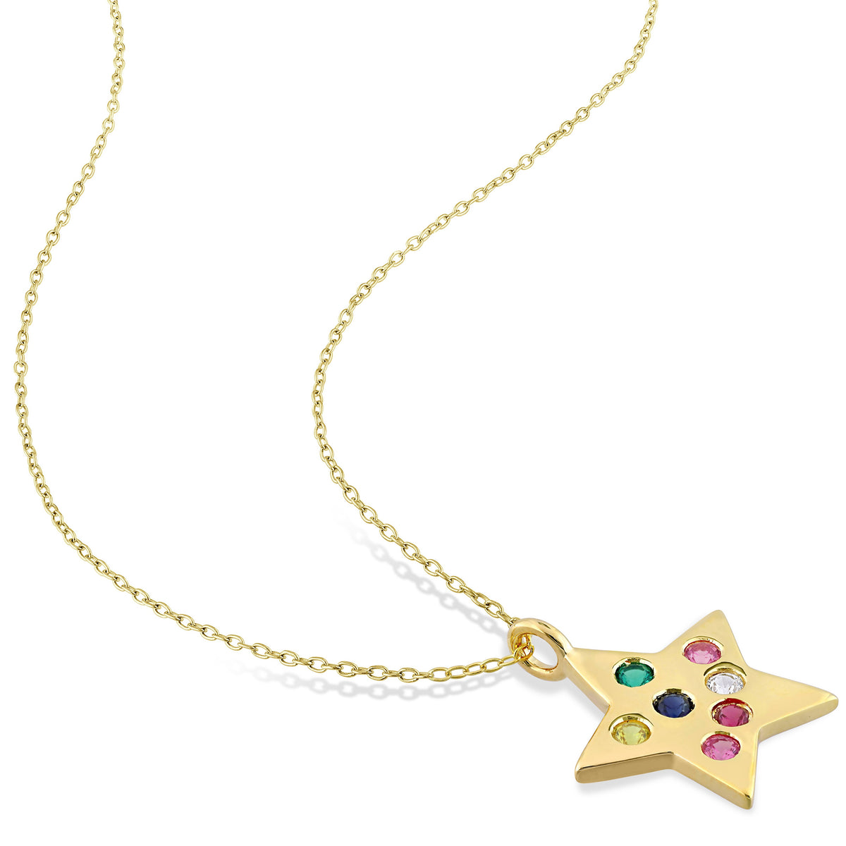 Yellow plated sterling silver, created white sapphire, created blue sapphire, created ruby, created pink sapphire, created yellow sapphire. Chain length: 18 inches. Spring ring clasp. Pendant dimensions: 18.6 mm wide x 22.1 mm long.