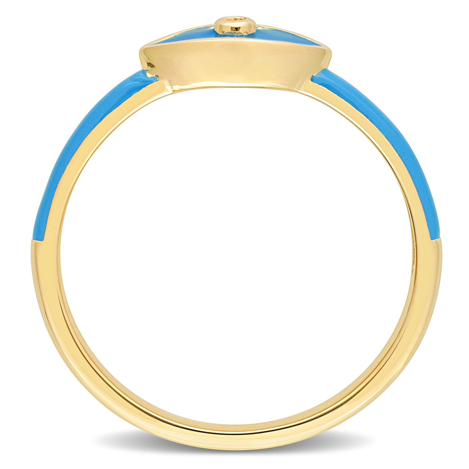This Mimi & Max Created White Sapphire Enamel Ring in Yellow Plated Sterling Silver is a vibrant, meaningful piece designed to offer protection and style. The ring features a round-cut bezel-set created white sapphire in the center of the classic evil eye design, set against a light blue enamel background. The polished yellow-plated sterling silver finish gives the ring a luxurious feel, while the symbolism of the evil eye adds a layer of personal significance. This ring makes a thoughtful gift for a loved one or a beautiful addition to any jewelry collection.