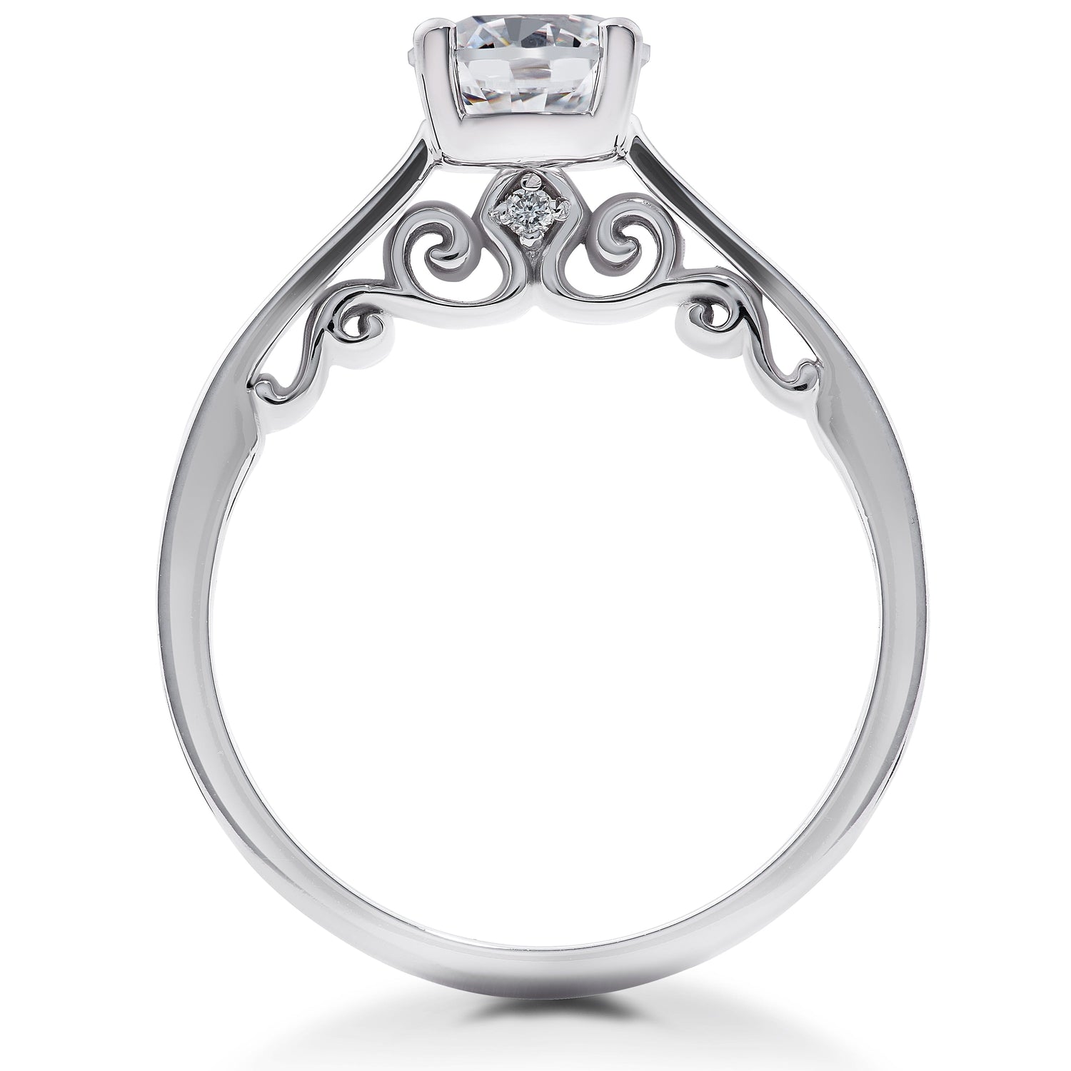 This 1 ct Lab Grown Diamond Gabriella Engagement Ring by Pompeii3 is a stunning symbol of love and sophistication. Featuring a 1 ct round brilliant-cut lab-grown diamond, flanked by two sparkling accent diamonds, this ring exudes classic elegance. Delicate filigree detailing enhances its vintage-inspired charm, making it a timeless choice.