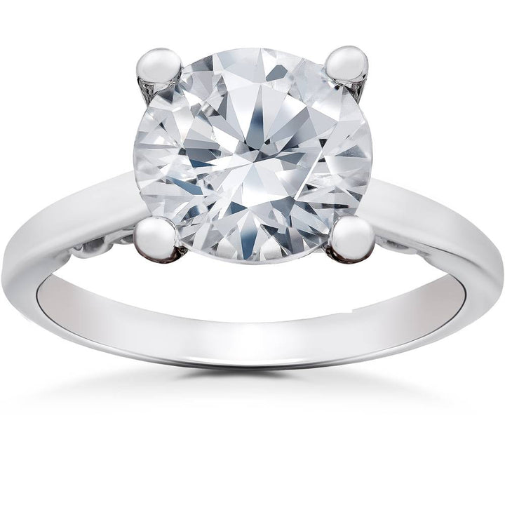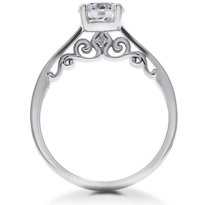Set in 14k white gold with a 2 ct round lab-grown diamond (G-H color, SI clarity) and two round lab-grown diamond accents. Prong-set with filigree detailing.
