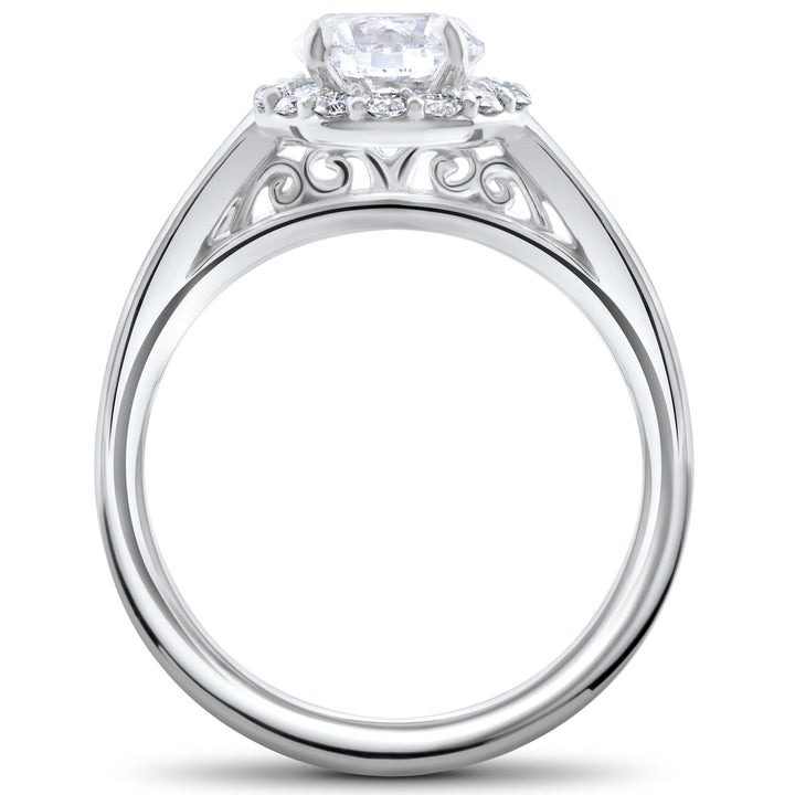 This 1 ct Lab Created Diamond Madelyn Halo Engagement Ring by Pompeii3 is a breathtaking blend of vintage elegance and modern brilliance. Featuring a 3/4 ct round lab-grown diamond, surrounded by a halo of 14 sparkling accent diamonds, this ring radiates sophistication. The delicate filigree detailing enhances its timeless charm.