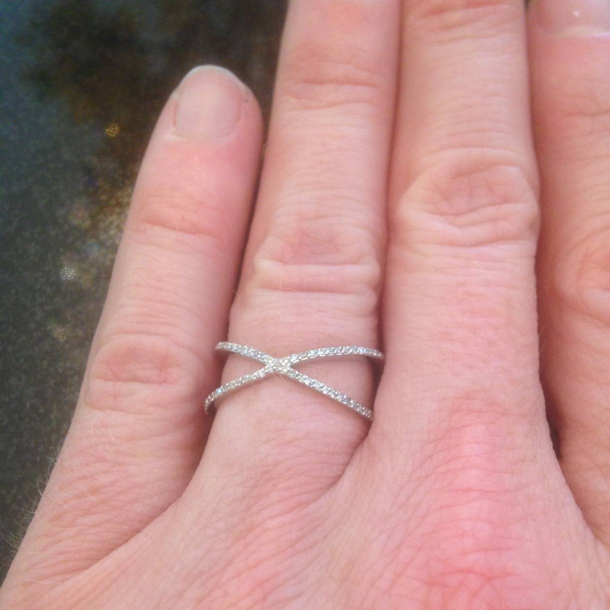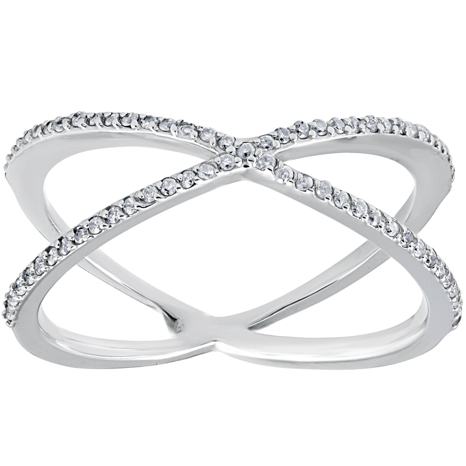 Solid 10K white gold band with 69 round cut diamonds (1/5ct total weight), showcasing a crossover design for a modern, statement-making look.