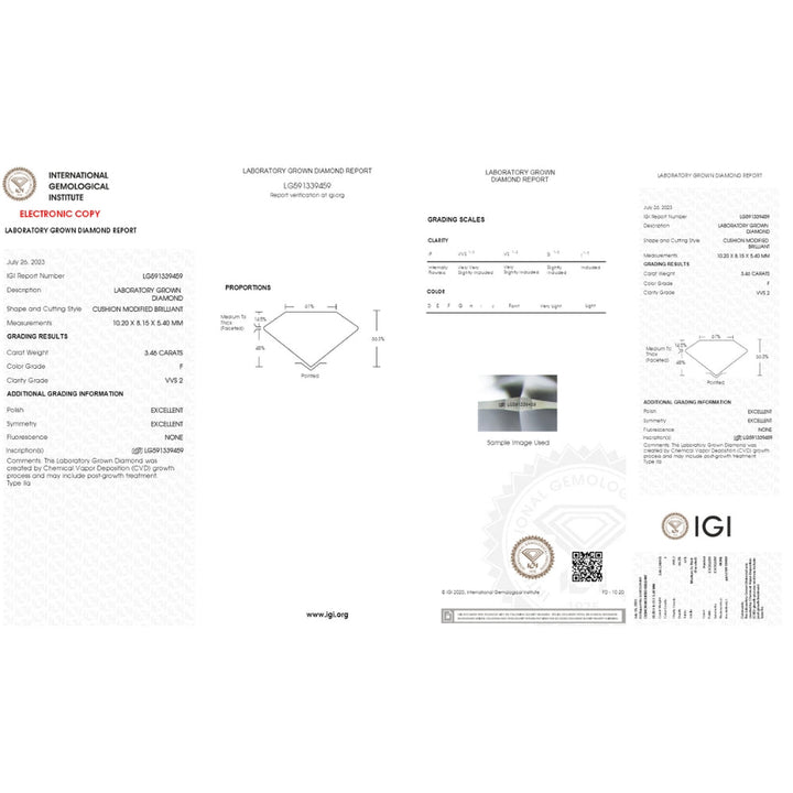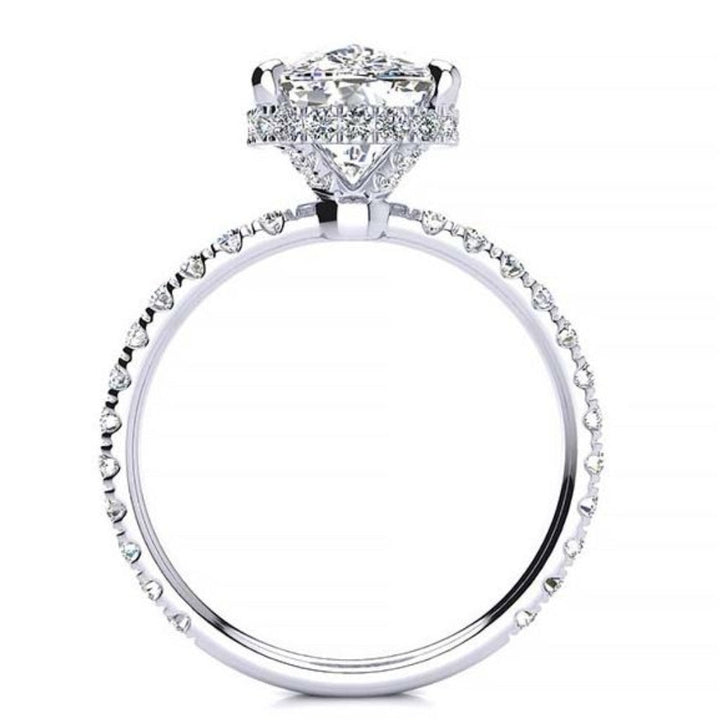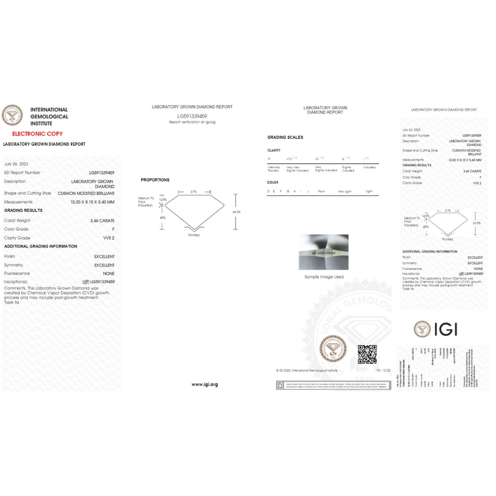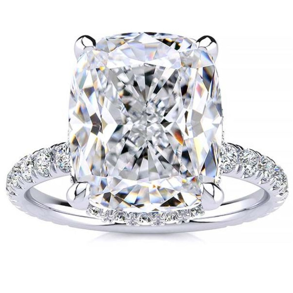 Set in 14k white gold with a 5.04ct elongated cushion-cut certified lab-grown diamond (F-G color, VS clarity). Includes side accent diamonds. Finger size 7. Other sizes available upon request.
